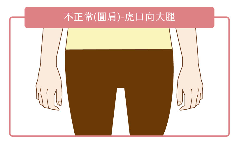 身體放鬆、腰背挺直,雙手自然低垂站直,如果此時雙手的大拇指與虎口是自然朝前的,即為正常狀態,若雙手虎口向內,即為圓肩。